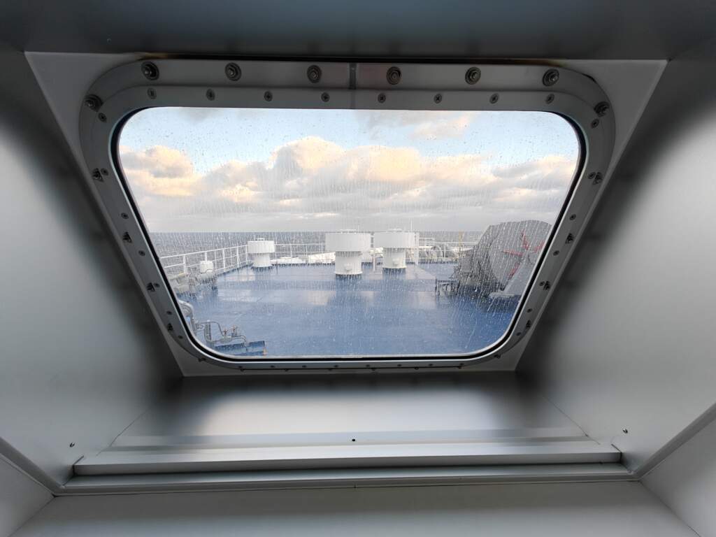 承承透過船艙的窗戶看外面~ 真的能看見遠遠的小小的港口!!