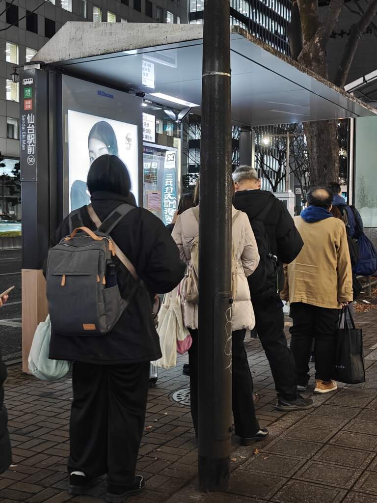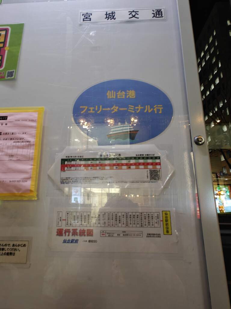 等候亭的看板上,有一個小小的仙台港的公車資訊,有個QR Code,建議掃這個進去查詢一下來的巴士的號碼,跟到達時間。因為我在回仙台的JR路上,有稍微查了下資訊,有看到別的網友分享說巴士時間表是寫17:42,但實際會再晚一點(我當天是17:50分巴士才進來)。沒來總是會怕怕的,畢竟這輛巴士晚上的時間只有這一班,這台錯過就沒有了。