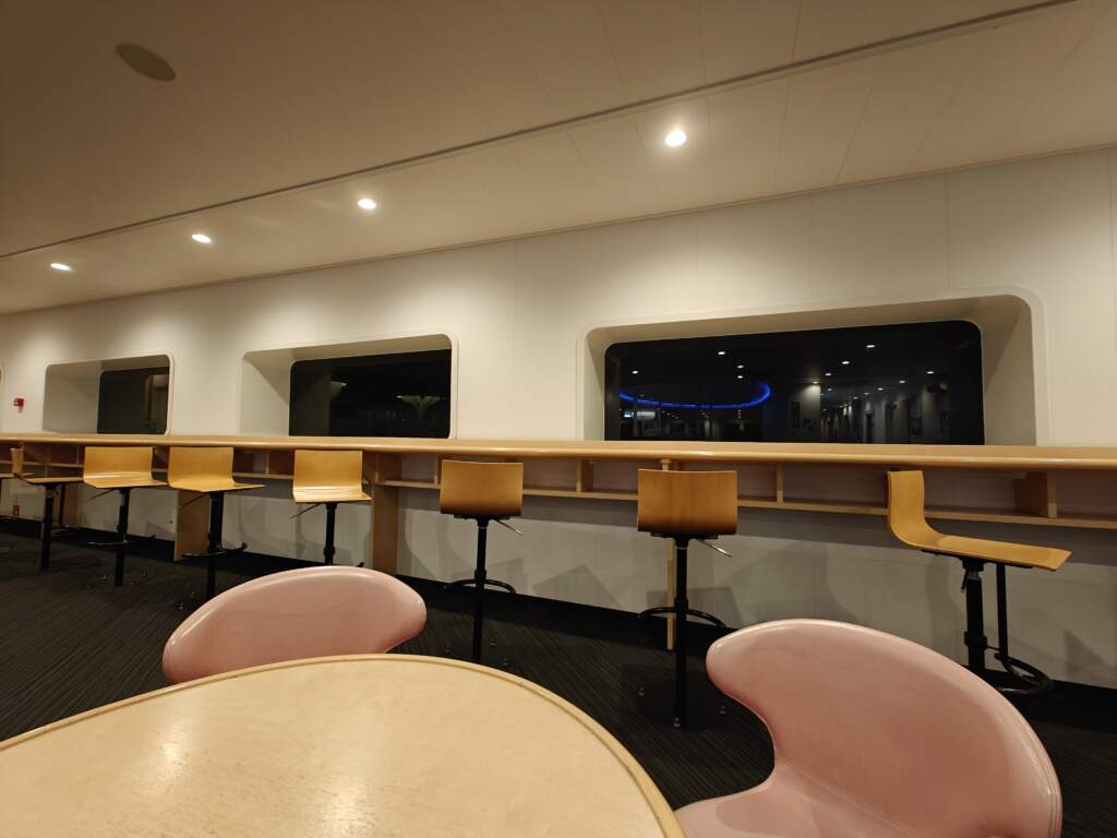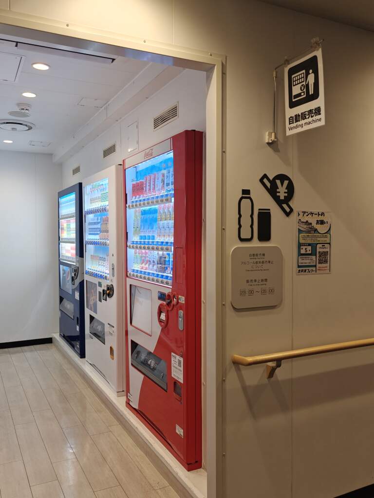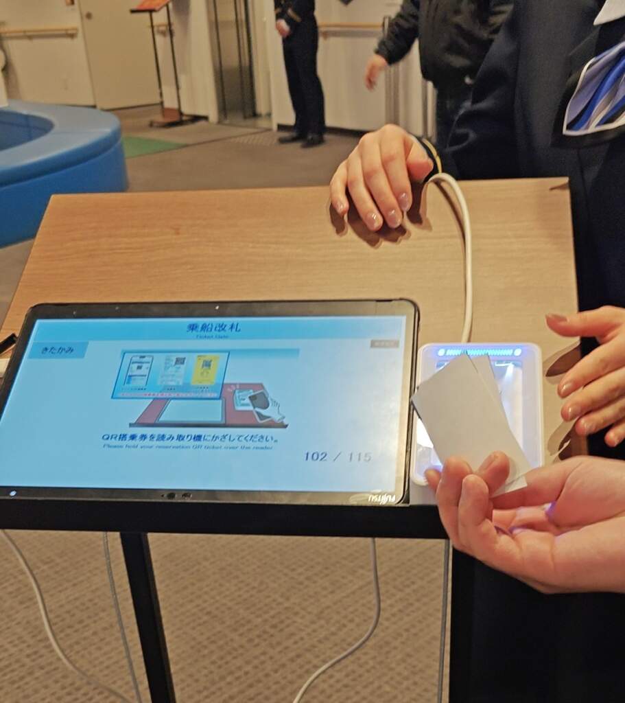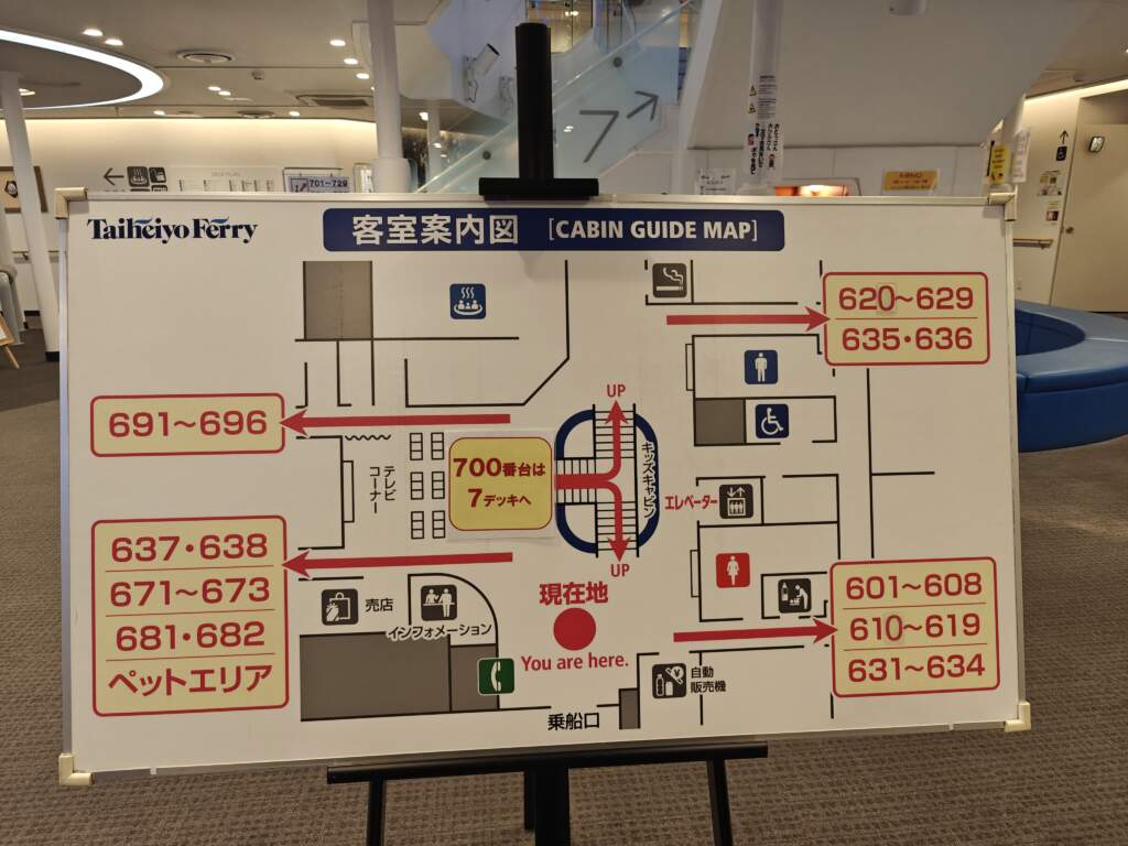 前往二樓,通過連結通道進入渡輪中。進到船上先把票拿出來掃QR Code,接著前方會有告示牌,指示你艙房的位子。