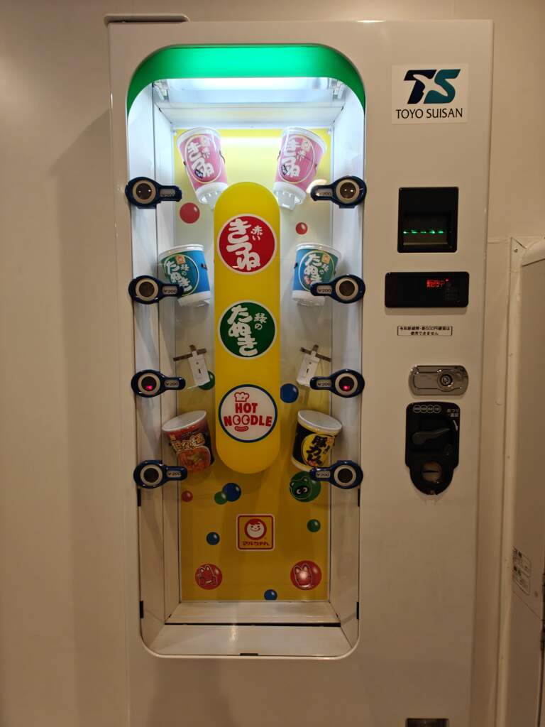 自助販賣機台,飲料有熱飲種類挺多的,還有冰淇淋。但泡麵選項不多。