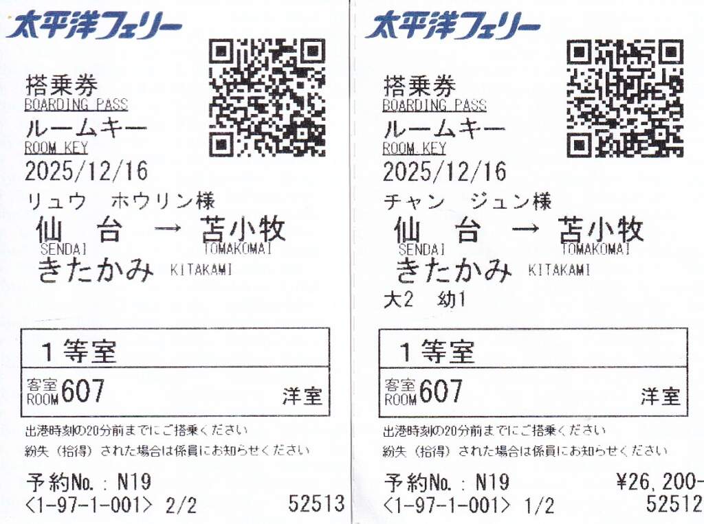 2025年12月16日,星期二。 行程規劃是 : 仙台港 → 北海道苫小牧 渡輪之夜
