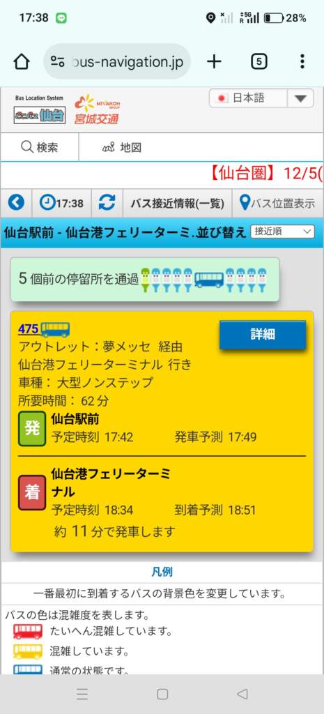 選 仙台駛前 跟 仙台港フェリーターミナル,就會出現今日搭乘的巴士號碼,我搭乘的是475號。
