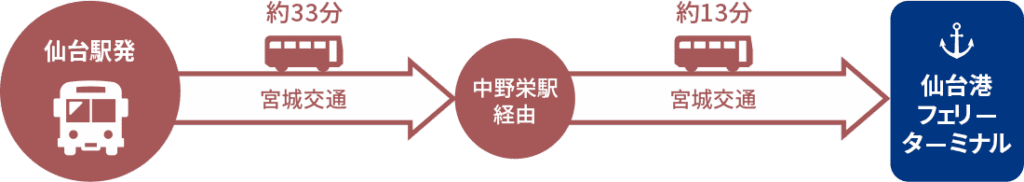 ●從JR仙台站 → 仙台駛前 (搭乘宮城交通巴士) → 仙台港フェリーターミナル